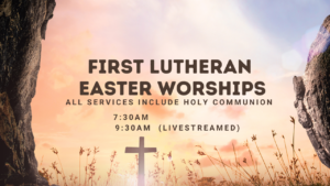 Come celebrate the joy and hope of Easter with us at First Lutheran Church! Join us for a vibrant and inspiring worship service (7:30am and 9:30am) as we rejoice in the resurrection of our Lord. With uplifting music, a powerful message, and a warm, welcoming community, Easter at First Lutheran is a time to reflect, celebrate, and experience the new life Christ offers. Bring your family and friends, and let’s share in the joy of this blessed day together! We can’t wait to see you there. Both services include Holy Communion.